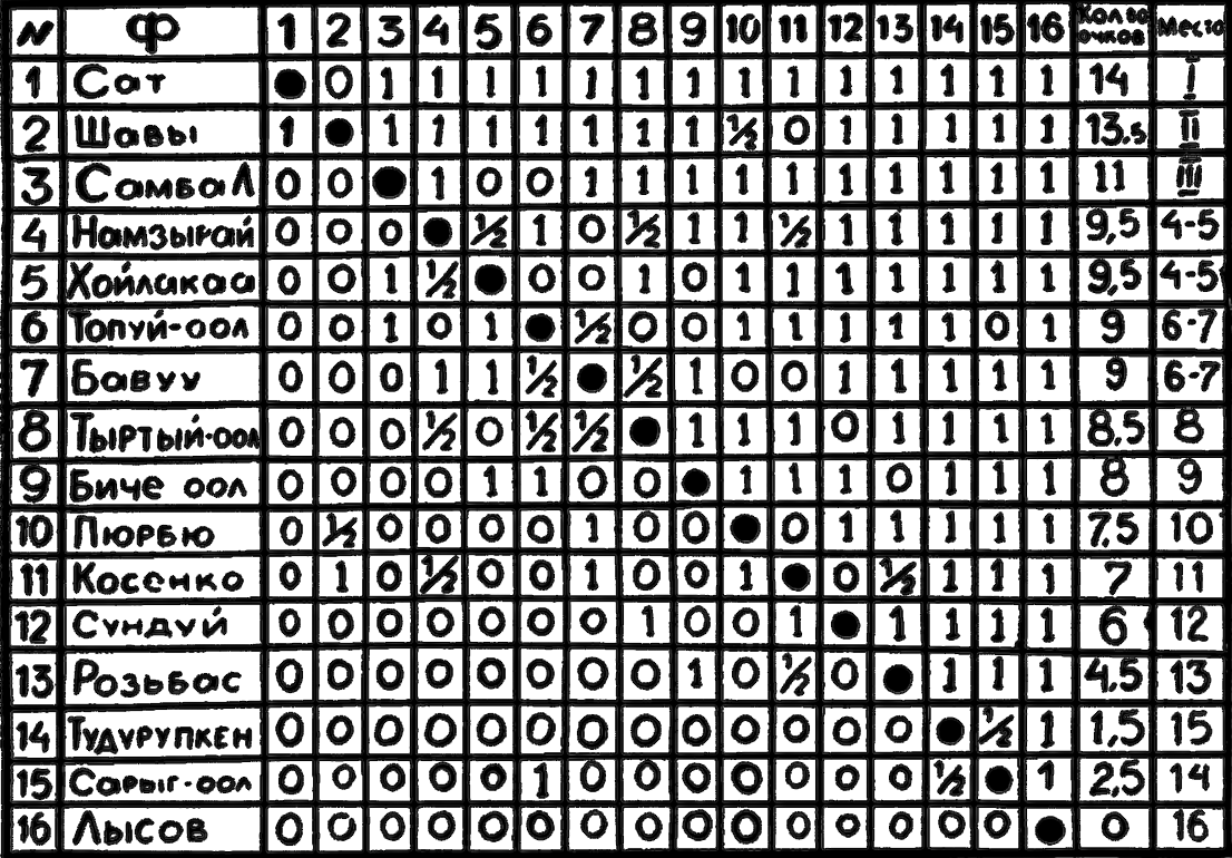 В марте 1937 года состоялся второй чемпионат республики, участие приняли лучшие шахматисты тех лет: Сат, Шавы, Самба-Люндуп, Намзырай, Хойлакаа и др.